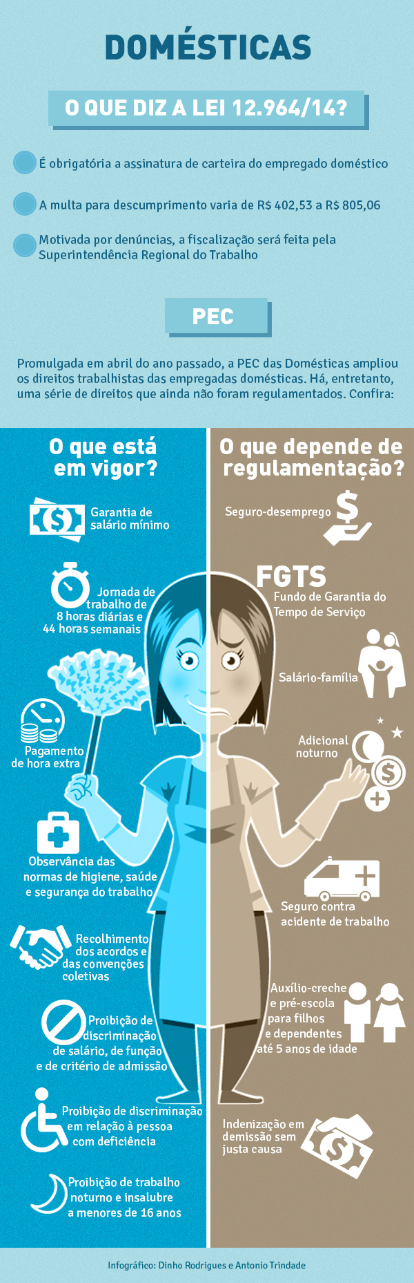 A lei que determina a punição por falta de registro não faz parte da chamada PEC das Domésticas, emenda constitucional que igualou os direitos dos empregados domésticos aos dos demais trabalhadores, promulgada em abril do ano passado. Entretanto, é considerada mais uma conquista dos trabalhadores já que pressiona os patrões a formalizar a situação dos domésticos. Vários dos direitos previstos na PEC das Domésticas ainda não foram regulamentados. Trabalhadores domésticos e defensores da categoria reclamam da demora para a consolidação de direitos considerados fundamentais como o Fundo de Garantia do Tempo de Serviço (FGTS), salário-família e seguro-desemprego. Com o ano eleitoral, a expectativa é que a regulamentação, parada na Comissão Especial do Congresso Nacional que trata do assunto, só saia no ano que vem.